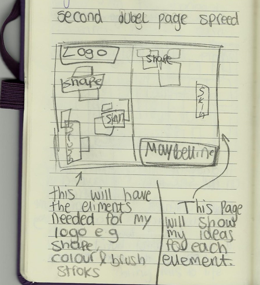 Here is the original sketched that I did in my journal when I was planning out the next page on my zine. I think this posses is very important as it saves time when on the computer creating the zine. This page would of been really hard to complete without me sitting down and planing out the arrangement on it first as I wasn't sure how to place my ideas to best show my vision, but overall I am really happy with the layout and I think it relates my creative process for the logo design.